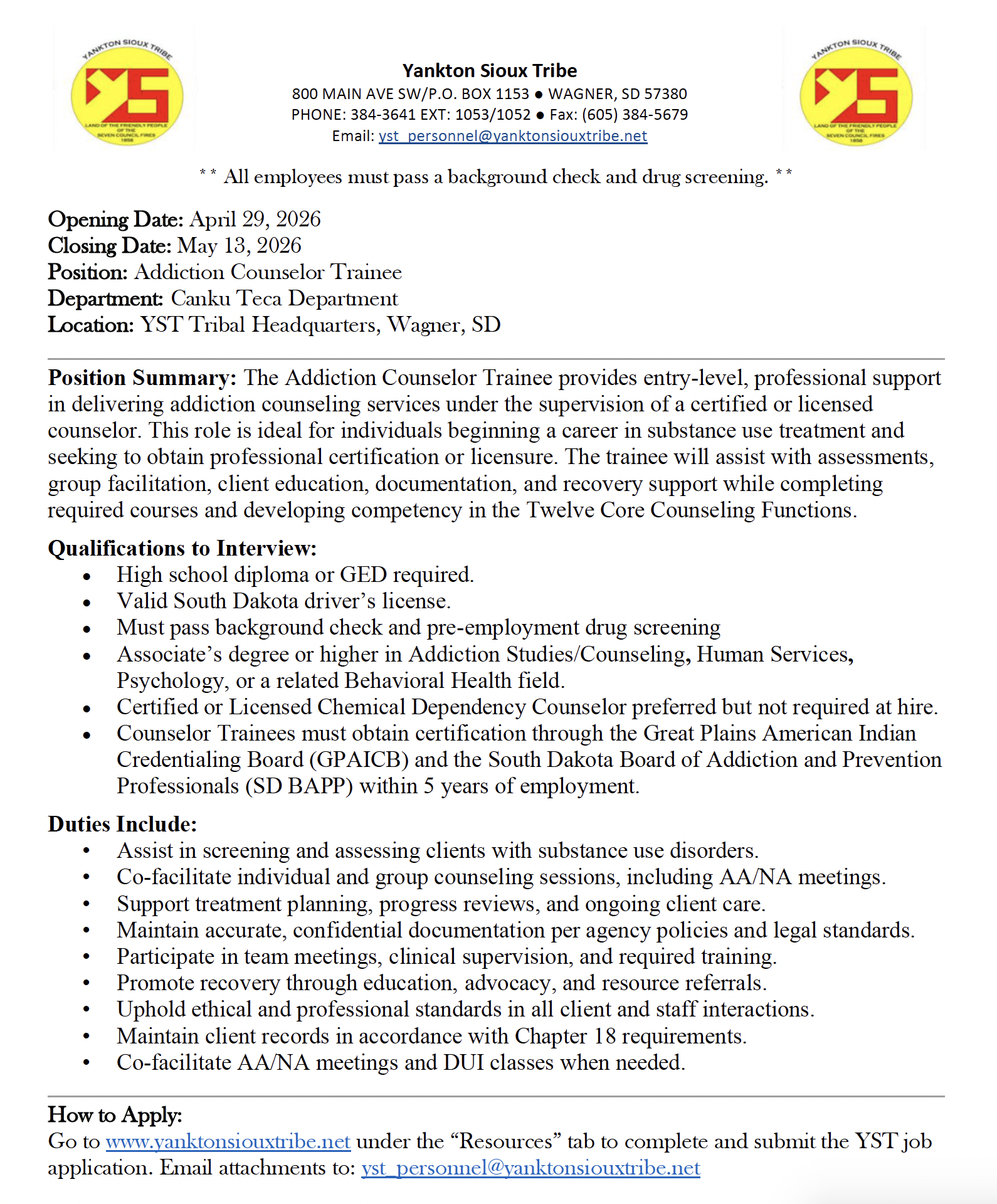 Patrol Officer Janitor chief of police Dispatcher/ data entry on-call driver Addiction Counselor Trainee